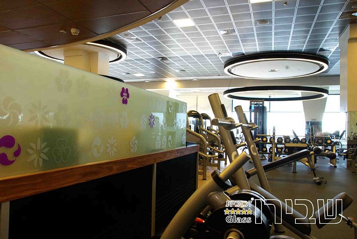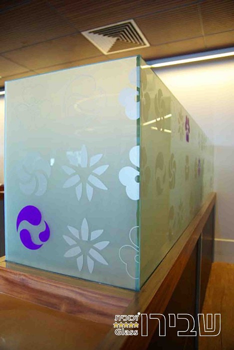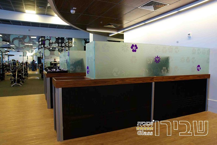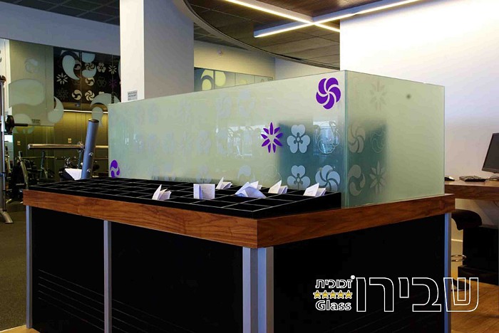דלפק זכוכית חלבית בהתקנה סמויה וללא אביזרים, כולל גרפיקה המשתלבת עם המראה הכללי של המבנה.