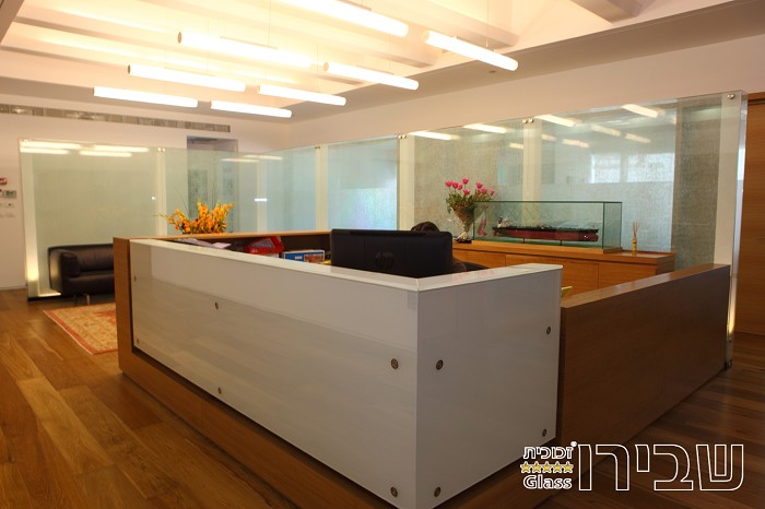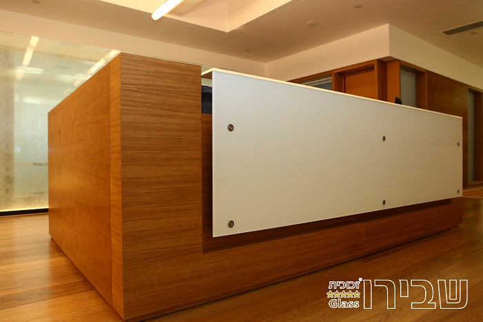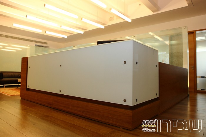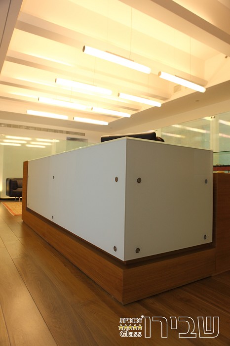 חיפוי דלפק קבלה בזכוכית לבנה. לוחות הזכוכית מעוגנים לדלפק באמצעות אביזרי הרחקה היוצרים מראה "מרחף". הזכוכית הלבנה משווה לדלפק מראה אלגנטי ויוקרתי, ומשתלבת עם מבואת הכניסה למשרד.