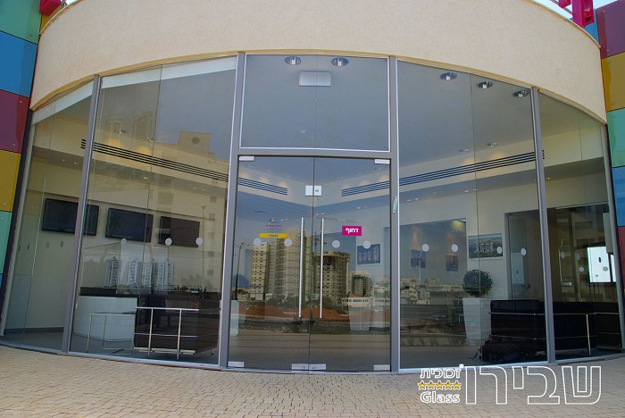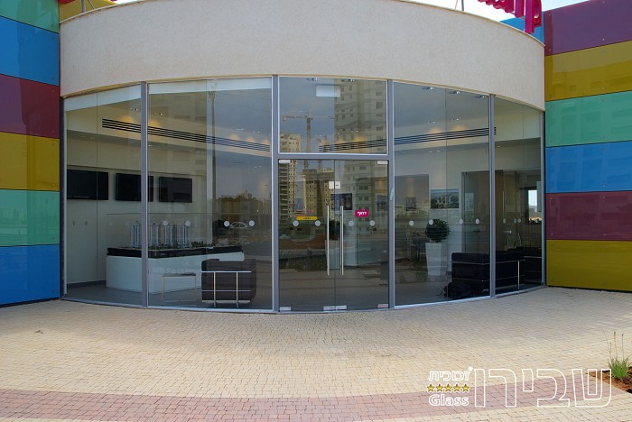 חזית כניסה למרכז מבקרים המורכבת מקבועים בגובה מלא. דלת פתיחה דו- כנפית וקושרת עליונה. עיגון לקונסטרוקציית פלדה ע"י פרופיל U היקפי. חיבור זוויתי בין לוחות הזכוכית, היוצר אשליה של זכוכיות מכופפות בהתאמה לחזית המבנה.