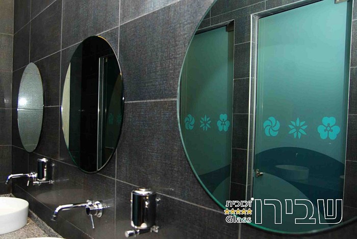 מראות עגולות בהדבקה על גבי קיר ובהתאמה לכיורים העגולים המונחים על השיש.