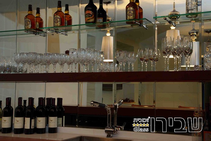 מראות מלבניות בעלות פאזה בגב בר משקאות, מודבקות על גבי הקיר.