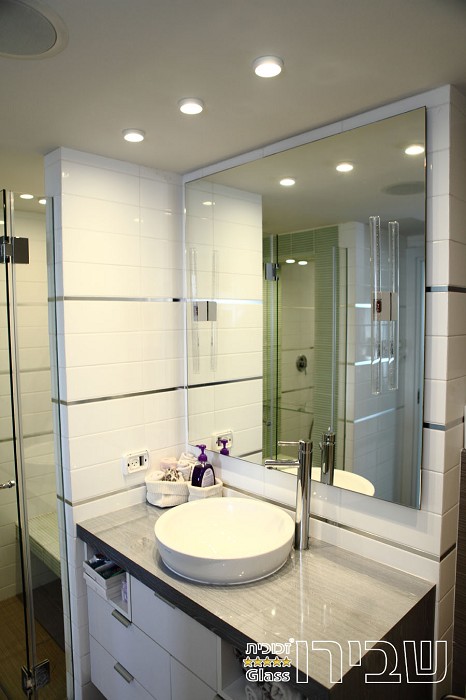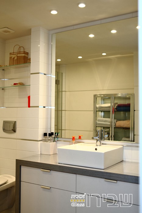 מראה מלבנית בהדבקה על גבי הקיר וללא אביזרים לקבלת מראה מלא ונקי.