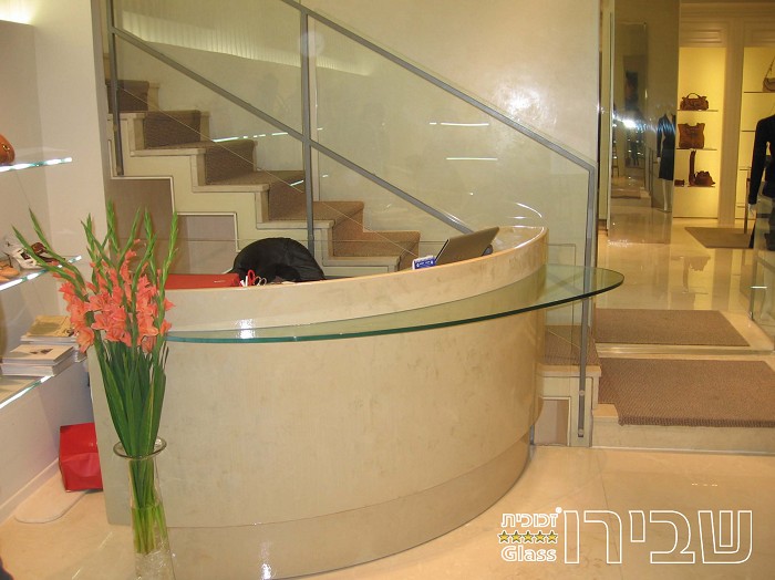 דלפק זכוכית מעוגל. מעוגן בהדבקה לדלפק שיש קיים בחנות מצידו החיצוני. דלפק הזכוכית מותאם בצורתו באופן מושלם לדלפק הקיים ומדגיש אותו.