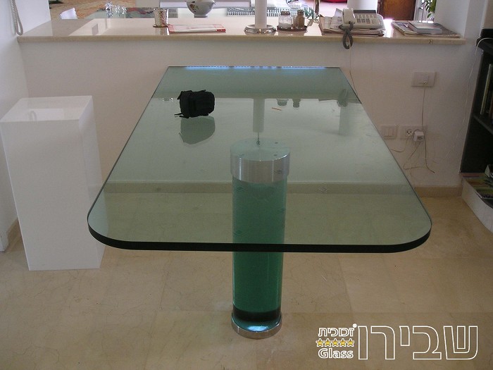 דלפק זכוכית מלבני. משטח הזכוכית מעוגן בצידו האחד למחיצה בנויה, ובצדו השני רגל זכוכית עגולה עם בסיסי נירוסטה. מתאים מאוד לשימוש בחללים קטנים ומאפשר ניצול מקסימלי של האיזור בו הוא מותקן.